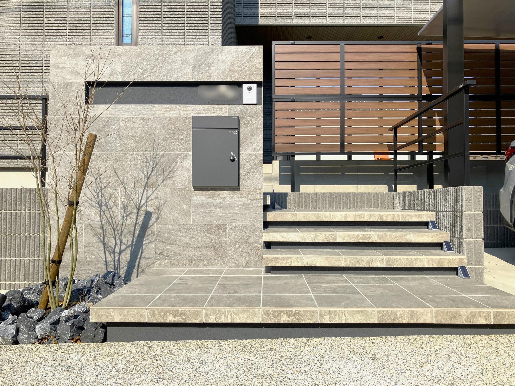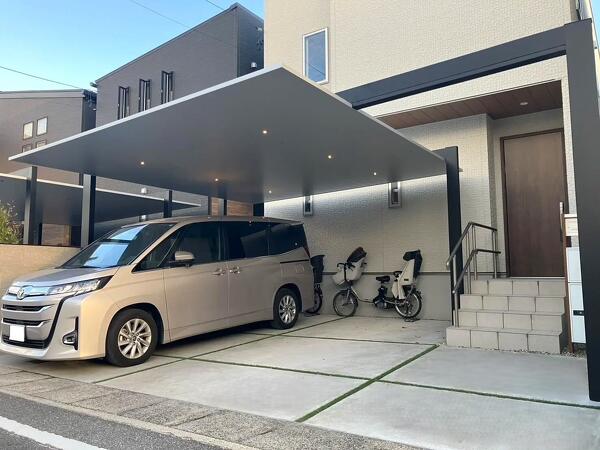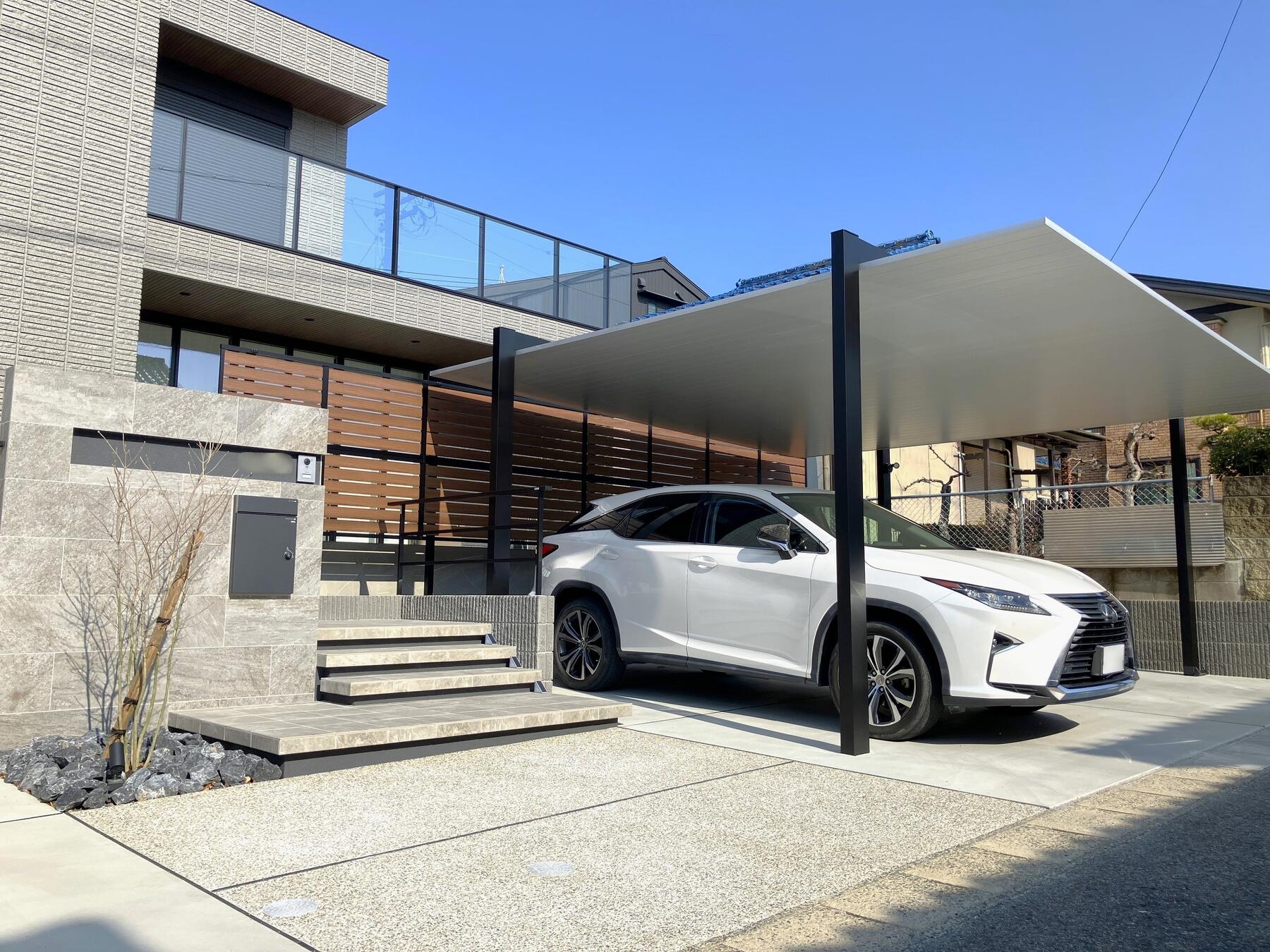 カーポートだけでなく、門柱や植栽にもこだわったデザインでお住いの印象を引き立てる