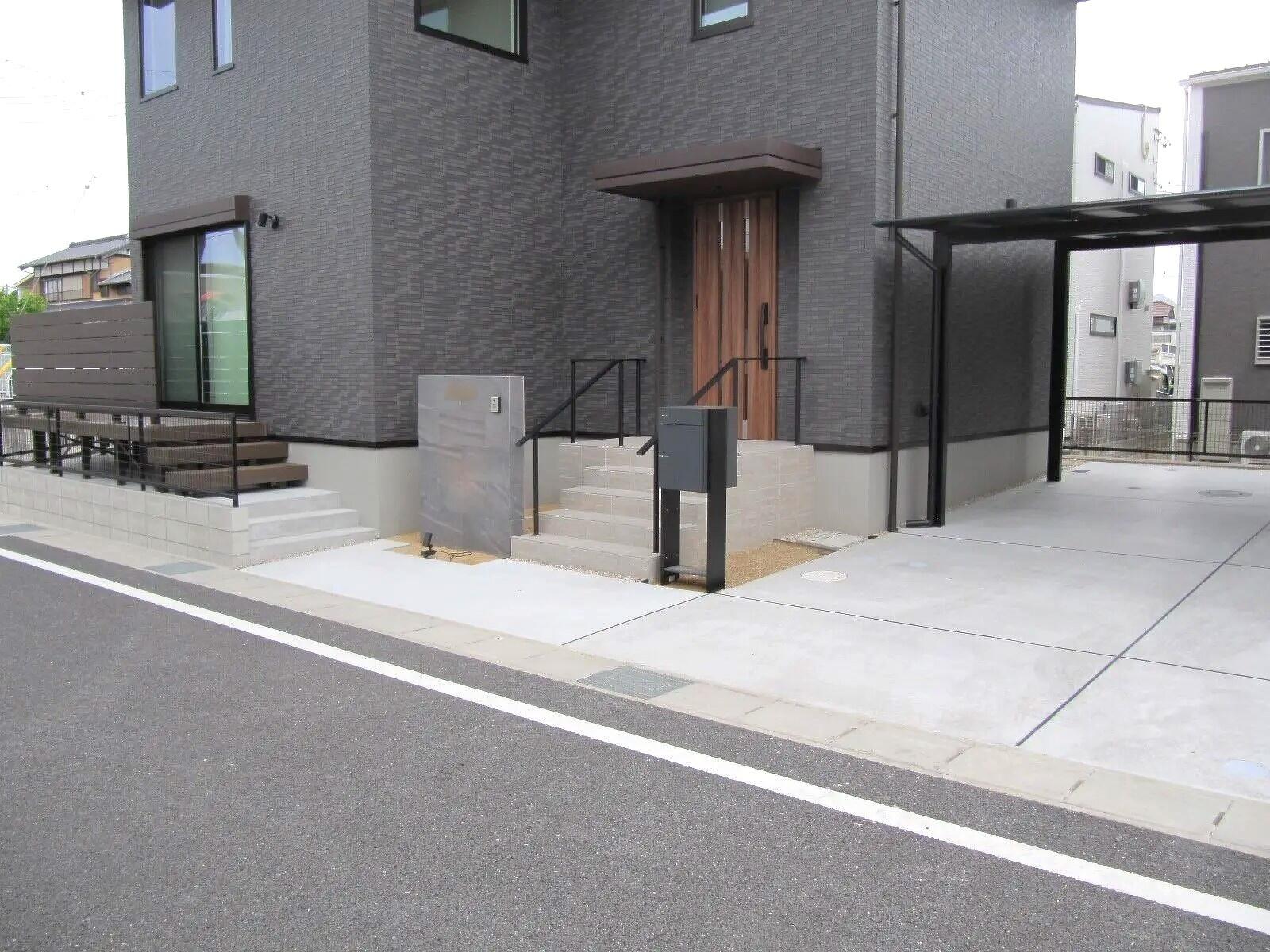 カーポート・フェンス・宅配ボックスをブラック色で統一しカーポートの屋根材もブラックポリカを使い一体感を待たせました。