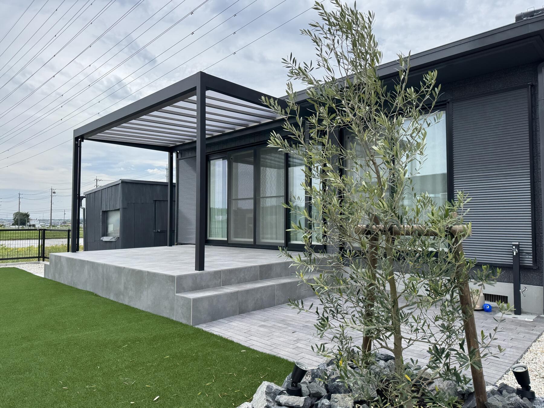 ルーフにタカショーのフレームルーフを提案させて頂きました。タイルテラスの上に設置することで、H24のフレームルーフが使用することができ、リーズナブルに雰囲気のあるルーフ空間となりました