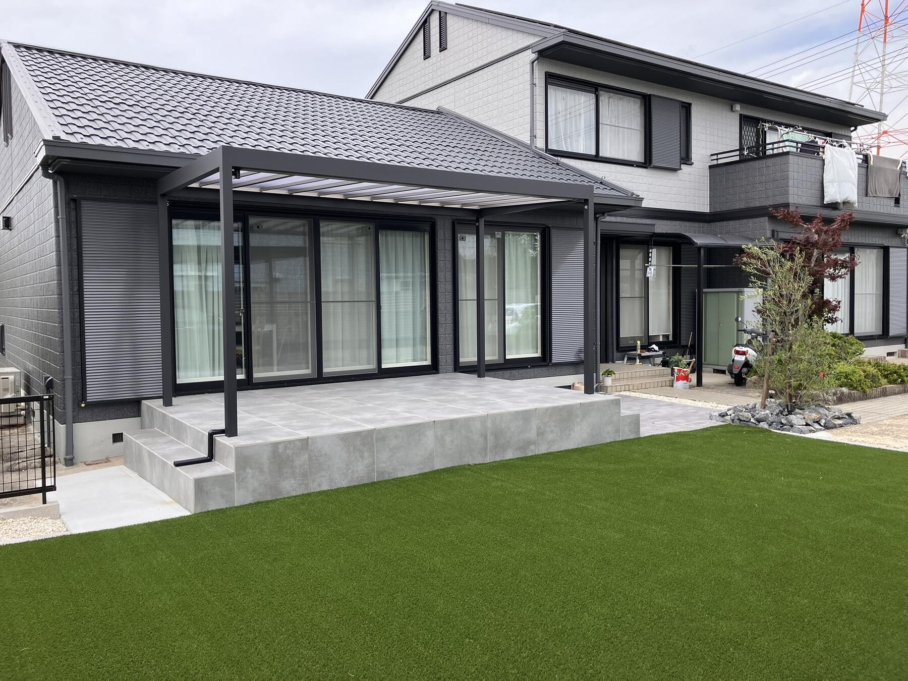 祖父の代につくった庭木が痛み、手入れが難しくなったためタイルテラスと人工芝の空間にしたいとの相談でした。