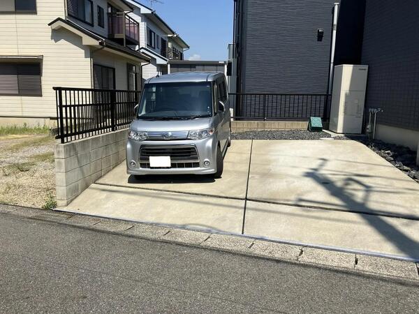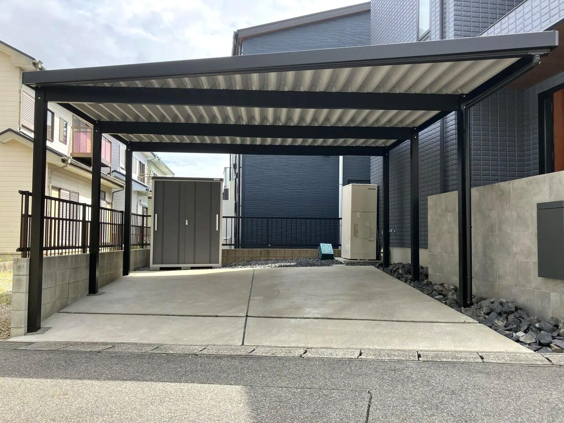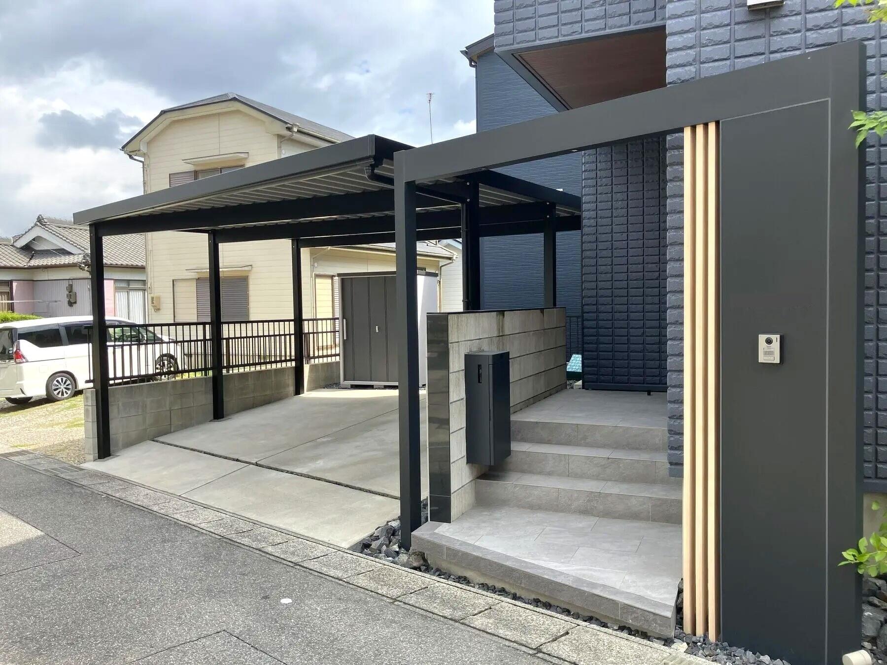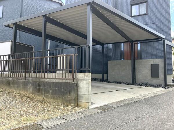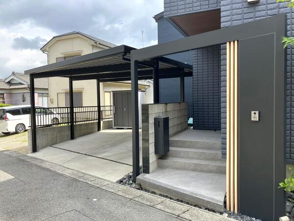 駐車場が変形しているが無駄なく屋根で覆いたい。既存の門袖などにもマッチさせたい。
