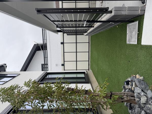 - YKKプレーンルーフ2台用、シンプレオフェンスYS2型、人工芝:メモリーターフ、立水栓:ジラーレW、